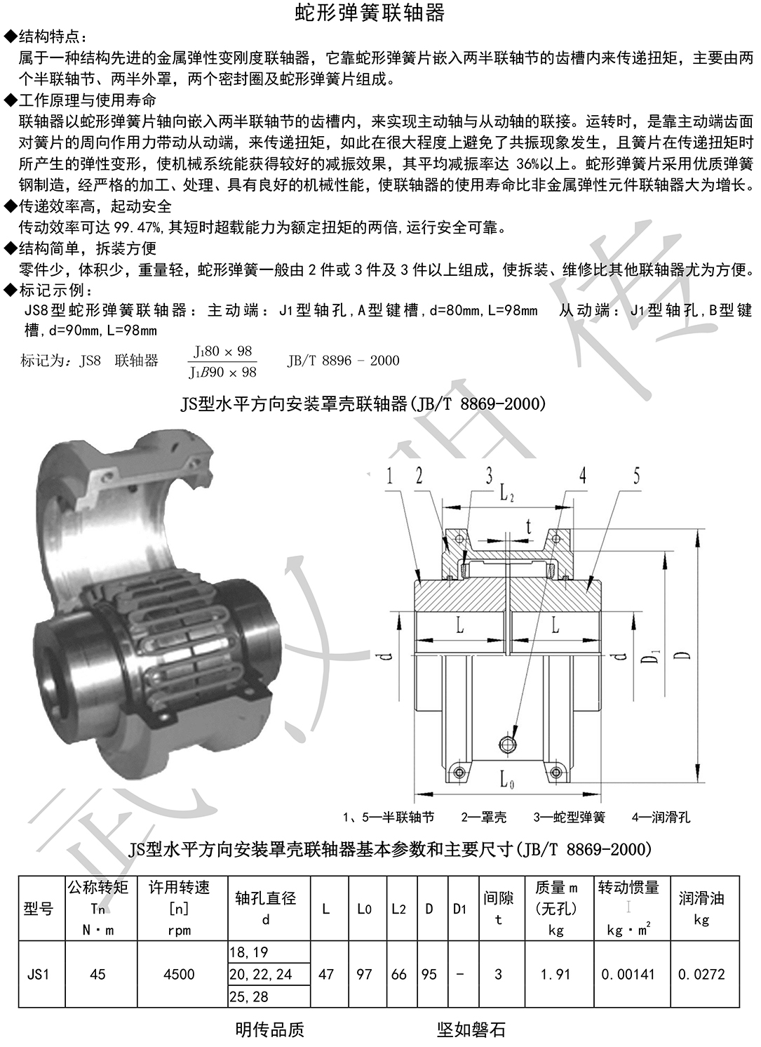 聯(lián)軸器以蛇形彈簧片軸向嵌入兩半聯(lián)軸節(jié)的齒槽內(nèi),來實(shí)現(xiàn)主動(dòng)軸與從動(dòng)軸的聯(lián)接。運(yùn)轉(zhuǎn)時(shí),是靠主動(dòng)端齒面對(duì)簧片的周向作用力帶動(dòng)從動(dòng)端,來傳遞扭矩,如此在很大程度上避免了共振現(xiàn)象發(fā)生,且簧片在傳遞扭矩時(shí)所產(chǎn)生的彈性變形,使機(jī)械系統(tǒng)能獲得較好的減振效果,其平均減振率達(dá)36%以上。蛇形彈簧片采用優(yōu)質(zhì)彈簧鋼制造,經(jīng)嚴(yán)格的加工、處理、具有良好的機(jī)械性能,使聯(lián)軸器的使用壽命比非金屬彈性元件聯(lián)軸器大為增長。